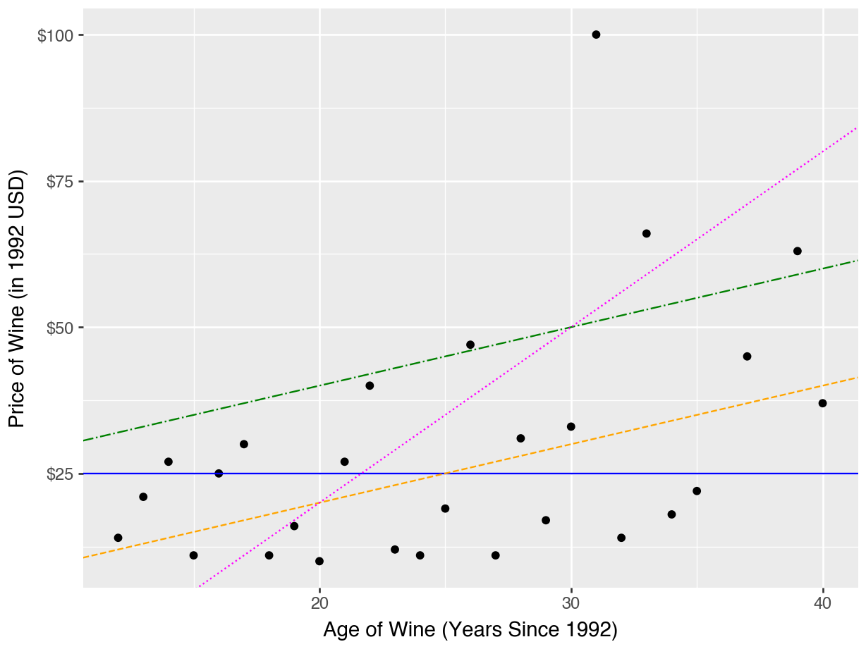 \[\text{price} = 25 + 0*\text{age}\] \[\text{price} = 0 + 10*\text{age}\] \[\text{price} = 20 + 1*\text{age}\] \[\text{price} = -40 + 3*\text{age}\]