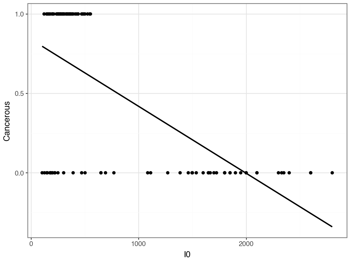 We know that in computers, True = 1 and False = 0. So, why not convert our response variable, Cancerous, to numbers and fit a regression?