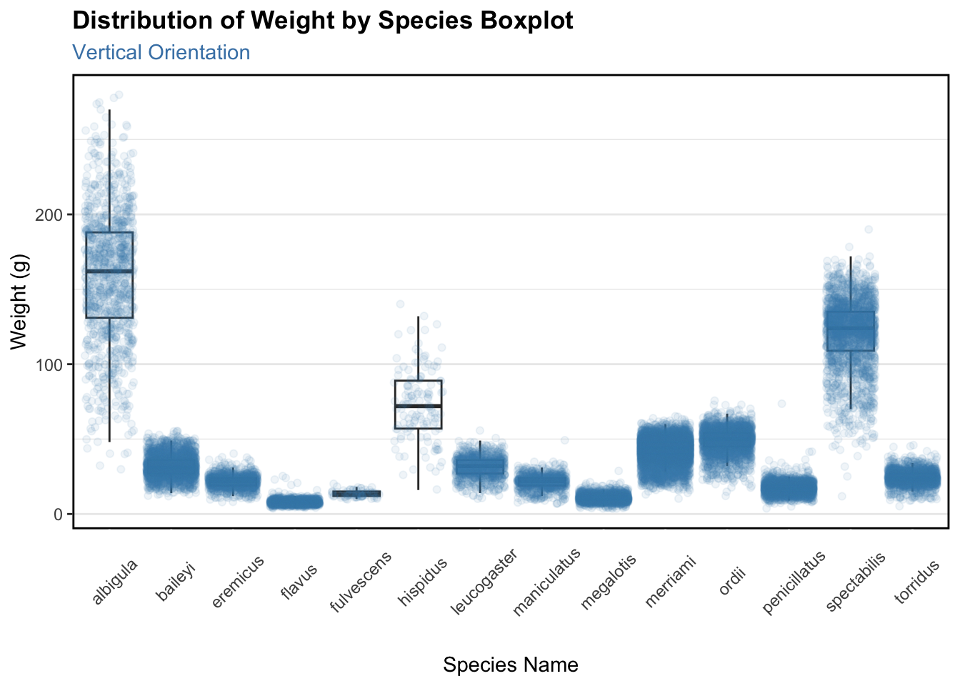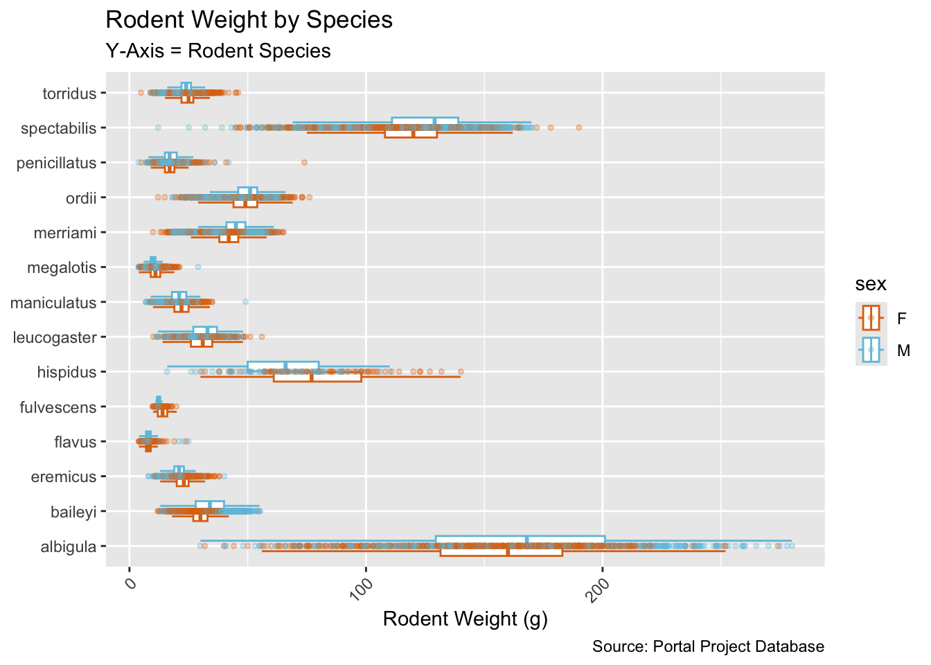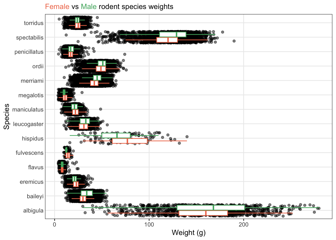 subtitle = "<span style = 'color:#f07857;'>Female</span> vs <span style = 'color:#4fb06d;'>Male</span> rodent species weights") +