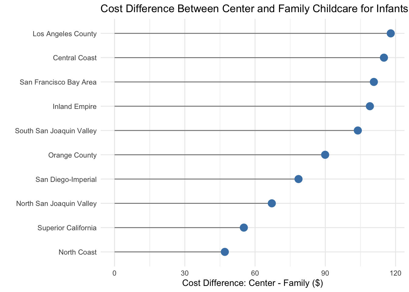 # Here is the data wrangling that happened to make this plot!ca_childcare_new <- ca_childcare |>filter(study_year ==2018) |>select(census_region, mc_infant, mfcc_infant) |>mutate(cost_difference = mc_infant - mfcc_infant) |>group_by(census_region) |>summarize(median_center =median(mc_infant),median_family =median(mfcc_infant),median_difference =median(cost_difference)) |>arrange(desc(median_difference))