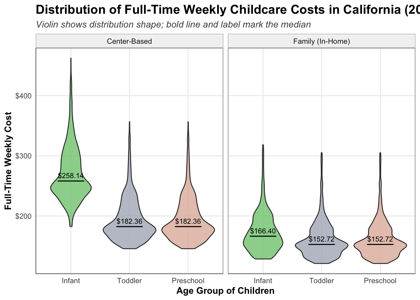 library(RColorBrewer)custom_colors <-colorRampPalette(brewer.pal(8, "Accent"))(10)ggplot(plot_data, aes(x = age_group, y = weekly_price, fill = age_group)) +geom_violin(trim =TRUE, alpha =0.8, linewidth =0.5) +stat_summary(fun = median, fun.min = median, fun.max = median,geom ="errorbar", width =0.45, color ="black", linewidth =0.5) +stat_summary(fun = median, geom ="text",aes(label = scales::dollar(after_stat(y))),vjust =-0.6, size =3, color ="black") +facet_wrap(~ setting, ncol =2) +scale_y_continuous(labels = scales::dollar) +scale_fill_manual(values = custom_colors) +scale_color_manual(values = custom_colors) +labs(title ="Distribution of Full-Time Weekly Childcare Costs in California (2008–2018)",subtitle ="Violin shows distribution shape; bold line and label mark the median",x ="Age Group of Children",y ="Full-Time Weekly Cost" ) +theme_minimal() +theme(legend.position ="none",panel.border =element_rect(color ="grey60", fill =NA, linewidth =0.7),strip.background =element_rect(fill ="grey95", color ="grey70"),plot.title =element_text(face ="bold", size =15),plot.subtitle =element_text(face ="italic", color ="grey30"),axis.title =element_text(face ="bold"),axis.line =element_line(color ="grey60"),panel.grid.minor =element_blank() )