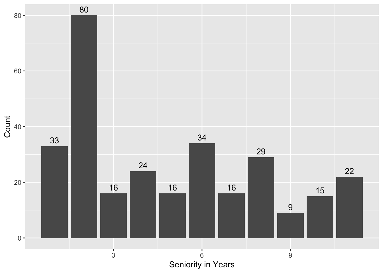 Because the p-value of our Chi-squared test of independence is less than 0.05 (0.006075), we know that there is an association between a teachers seniority and their SET scores from question 3 on if the professor used activities to make the class more engaging. Combining this Chi-squared test with the graph, we can see that more experienced teachers do a better job of implementing engaging activities is their classes.