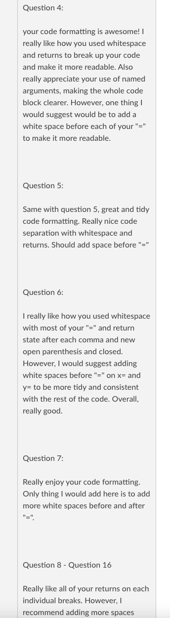 The following is the feedback that I gave that I’m most proud of in one of my peer review. I included an in-depth review of my peer’s general code formatting. I also gave some suggestions on how to write more tidy codes like adding more spaces between "=" and adding more return statements after ","