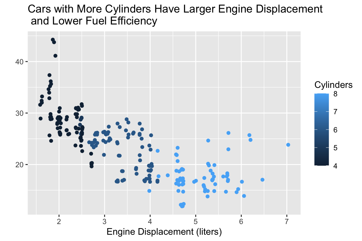 title = "Cars with More Cylinders Have Larger Engine Displacement\n and Lower Fuel Efficiency") +