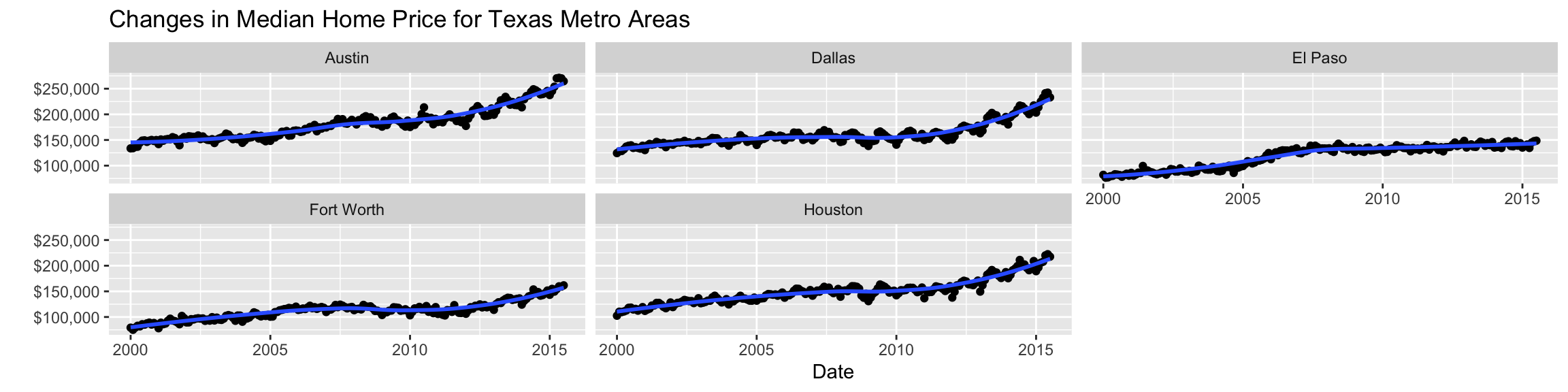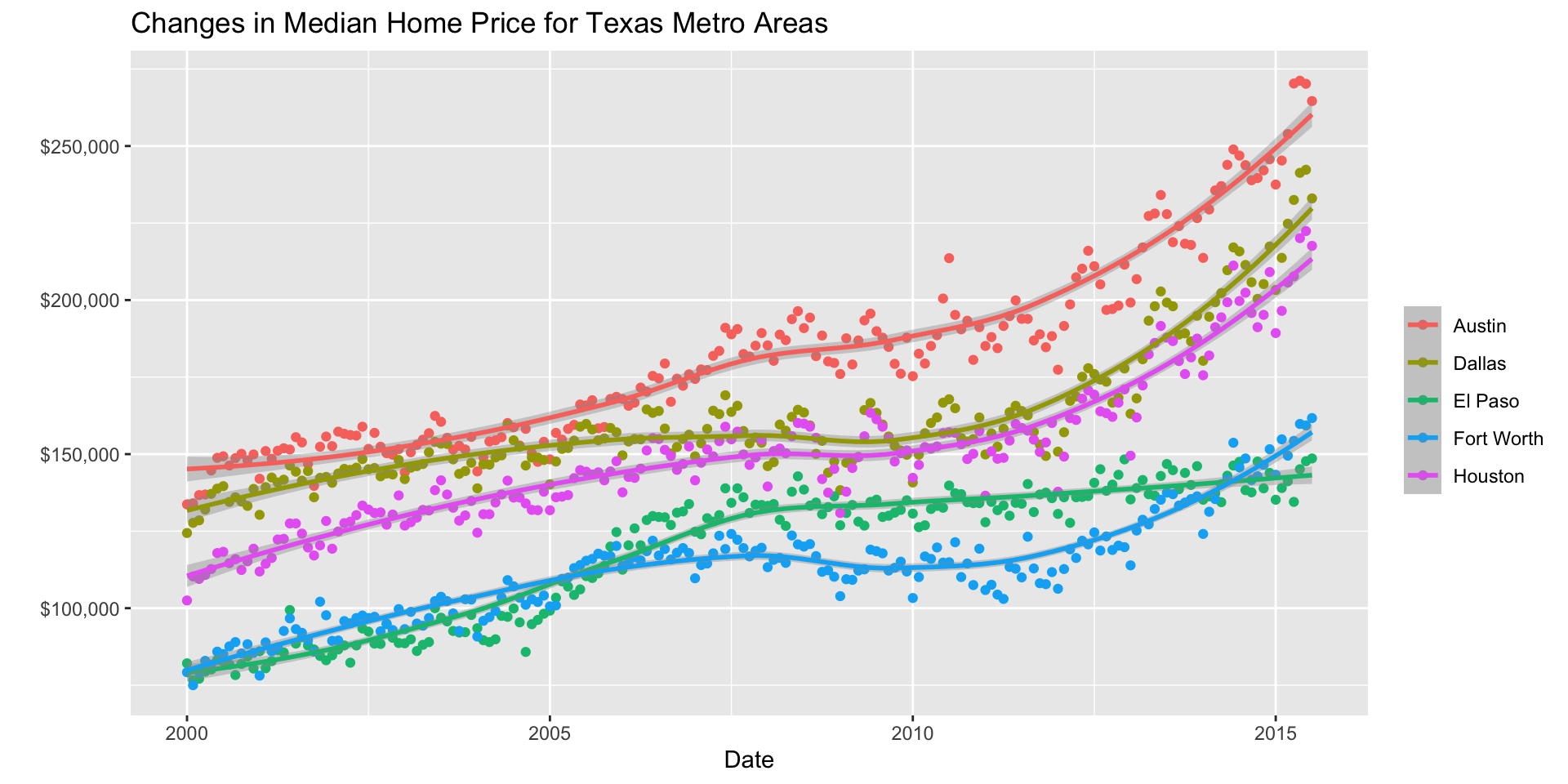 Make a plot of median house price over time (including both individual data points and a smoothed trend line), distinguishing between different cities .