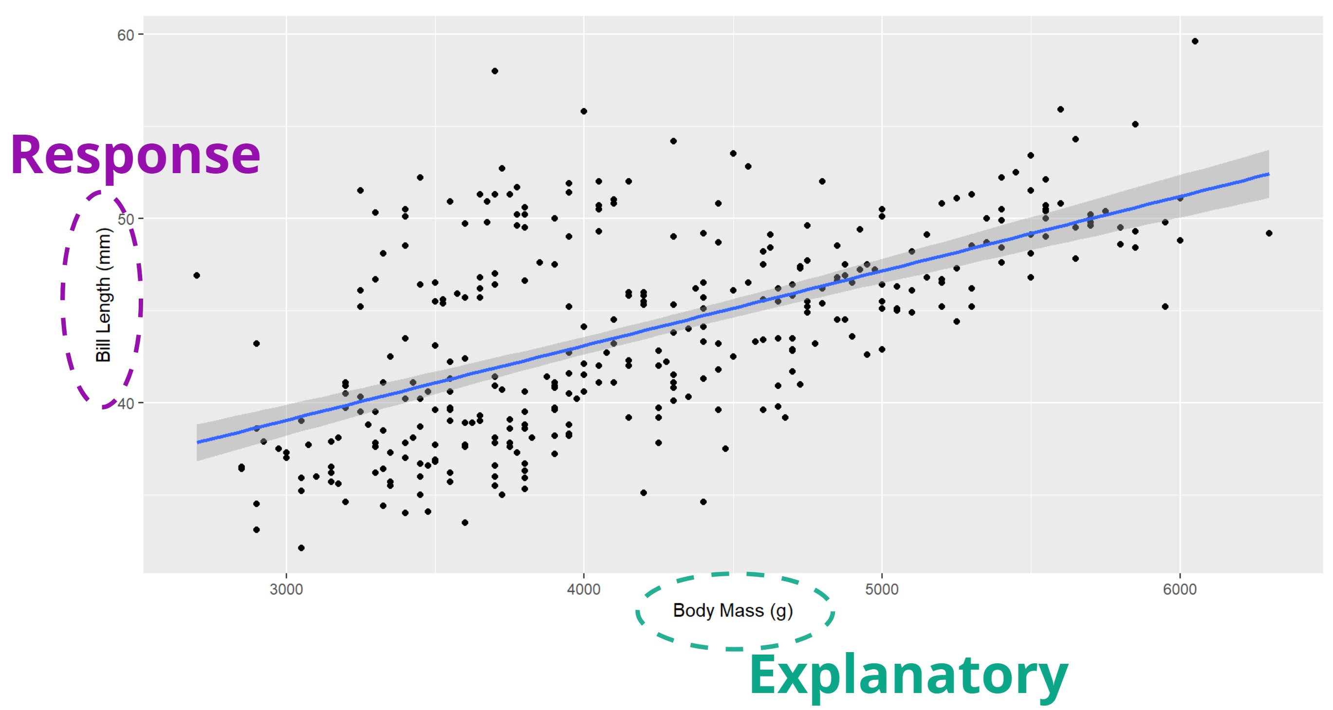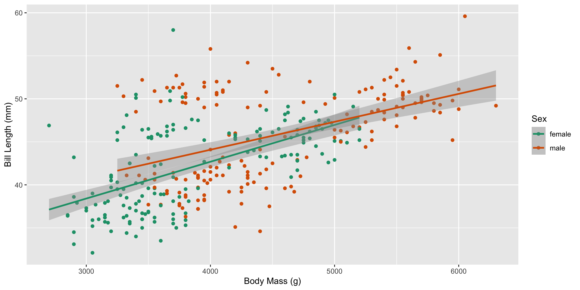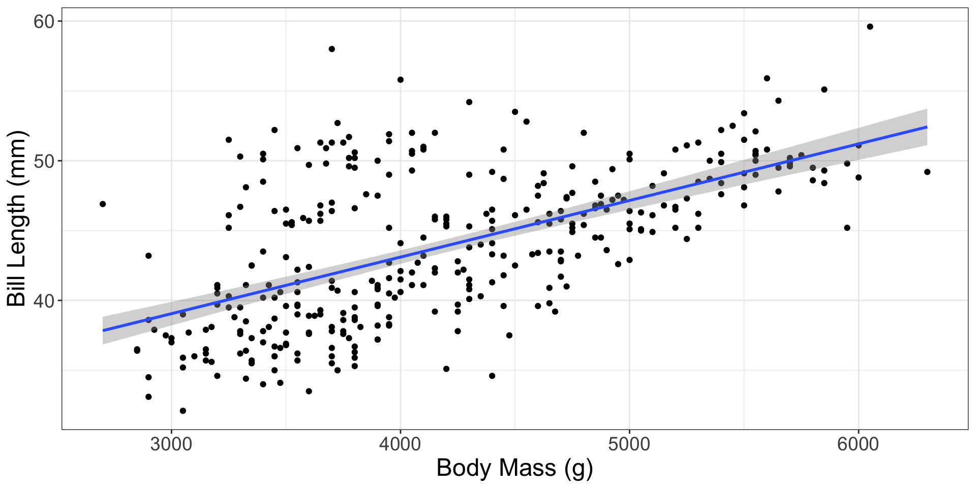 \[\widehat{\text{bill length}} = 26.899 + 0.004 \times \text{body mass}\]