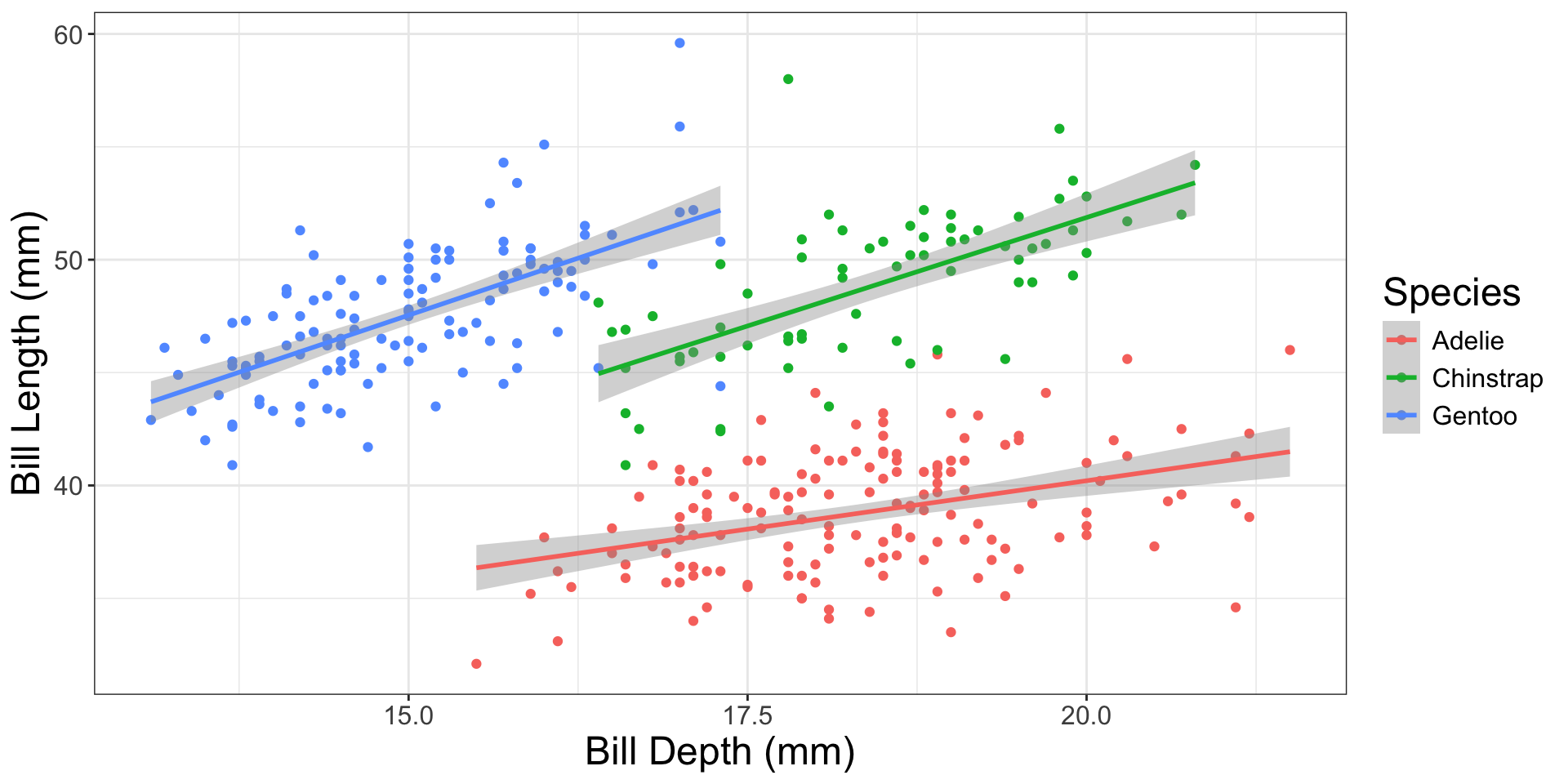 species_lm <- lm(bill_length_mm ~ bill_depth_mm * species,